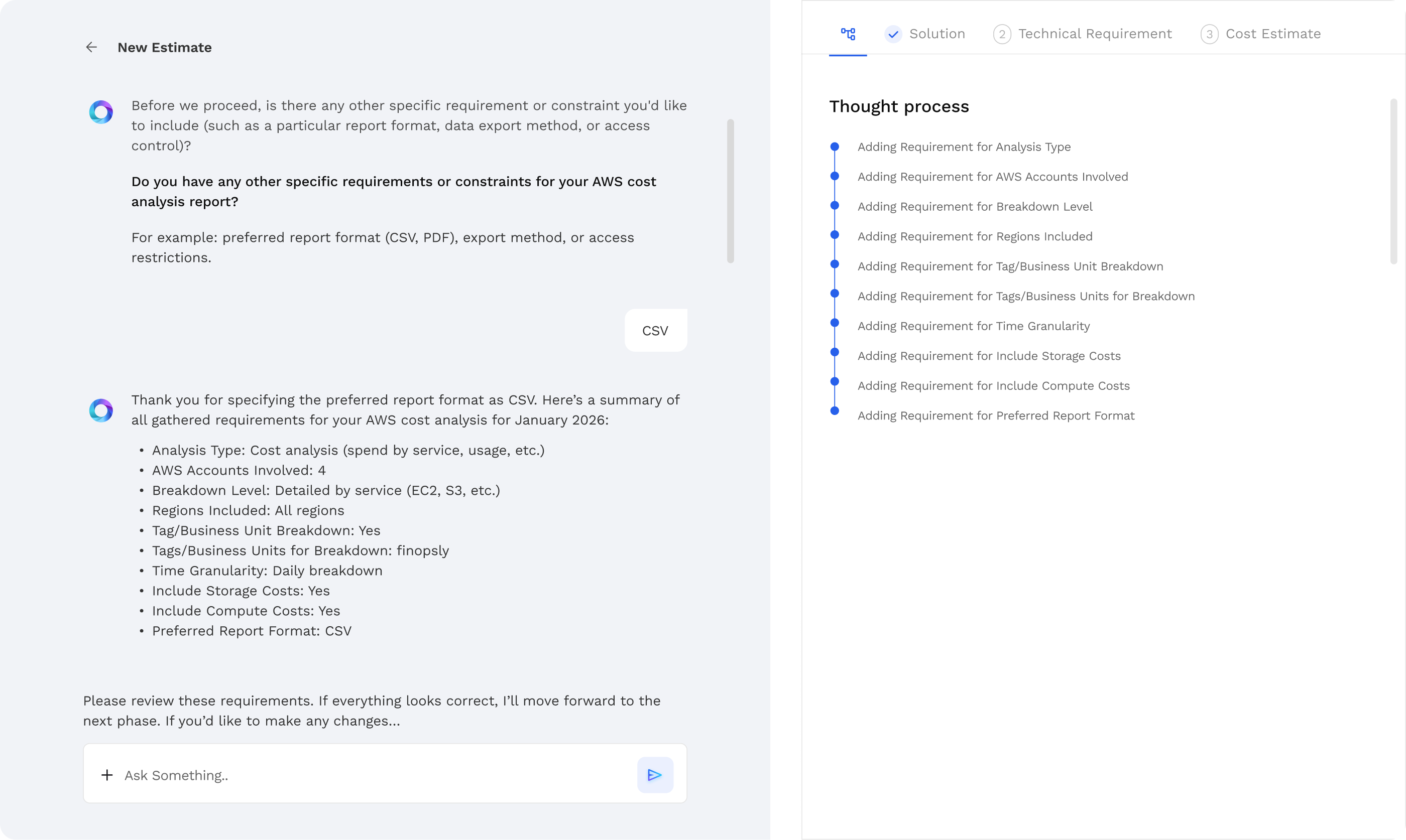 Costix is designed to streamline cloud cost estimation through an interactive, conversational interface. By leveraging a multi-agent framework, it gathers requirements, generates tailored cloud solutions, defines technical specifications, and produces detailed cost estimates through natural dialogue.