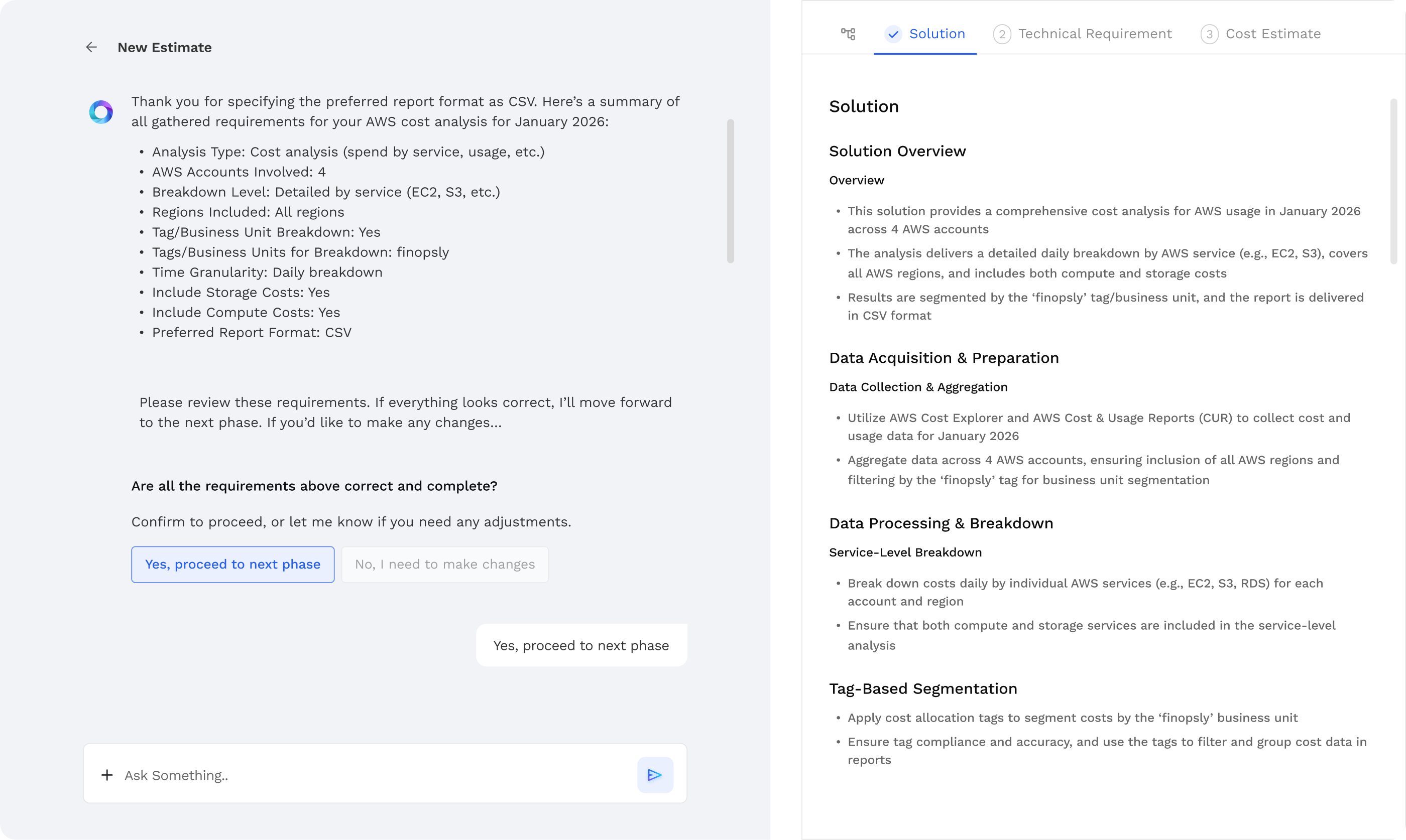 The system operates across four key phases—Information Gathering, Solution Generation, Technical Requirements, and Estimate Generation—with specialized agents working together to deliver accurate, structured, and comprehensive cost projections.